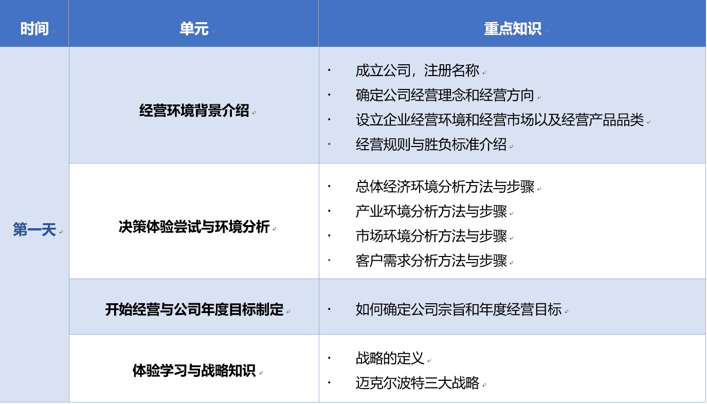 BOSS將參加訓練人員隨機分成多個相互競爭的小組,每小組5~7人,分別擔任CEO、生產總監、營銷總監、研發總監、財務總監,模擬產品在四個經濟狀況不同的地區展開設計、生產與銷售的全方位競爭,通過5~6個財務季度的管理運營期,使參與者學會如何在一個動態的、快速變化的全球化商業環境中駕馭企業。
