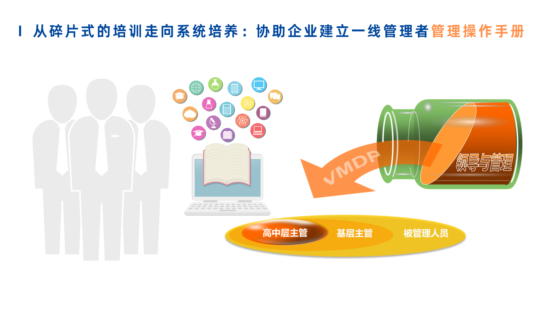 主管需要一套有系統,有效率的方法,幫助達成績效,好主管就像站在艦橋上指揮調度的艦長,必須確保所有船員手眼協調,才能發揮最大力量,VMDP「價值導向的管理能力發展計劃」教導主管如何「規劃」、「組織」、「指導」、「跟進」員工,迅速學會主管所應具備的能力與知識。